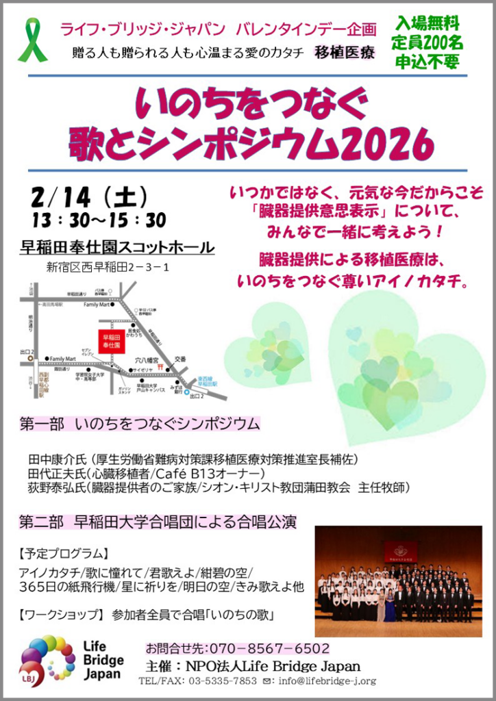 Life Bridge Japanは、日本の移植医療における深刻なドナー不足の問題解決と、移植に係わる人たち(移植者、ドナー、家族)のより良い社会生活を支援する為に、市民とふれあい、問題を共有し、環境づくりに努め社会福祉支援を協働で行います。