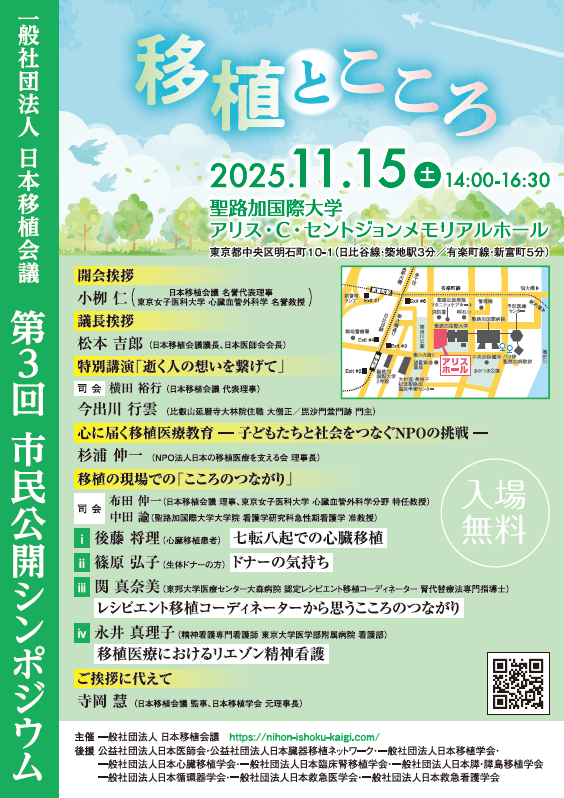一般社団法人 日本移植会議 「第3回 市民公開シンポジウム」が開催されます。